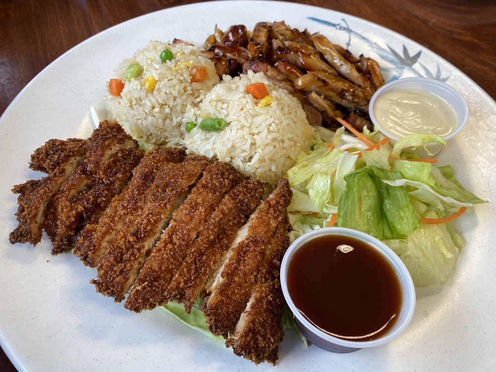 Dinner includes chicken teriyaki, vegetable yakisoba noodles, 5 Pieces of gyoza, large side salad, large steamed rice(Fried rice option), customer has options between orange chicken or sweet sour chicken (pick 1 only), and customer has options between pork teriyaki or beef teriyaki (pick 1 only).
