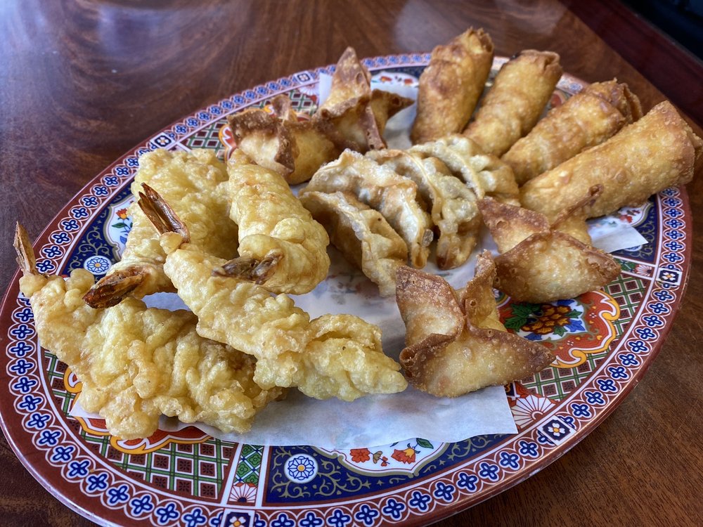 1 egg roll, 4 gyoza, & 3 crab rangoon.